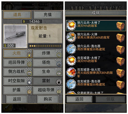游戏的系统设置也是非常的到位。首先,主要任务是打通不同的关卡,玩家在游戏中通过收集金币来升级飞机的护甲、子弹威力和其他的如巡航导弹等等。另外,你也可以购买金币,然后在商店里购买各种道具来提升飞机的各种性能,让你在天空中变得更加的强大。支线任务就是完成各种的成就,完成不同的成就就会有不同的奖励。